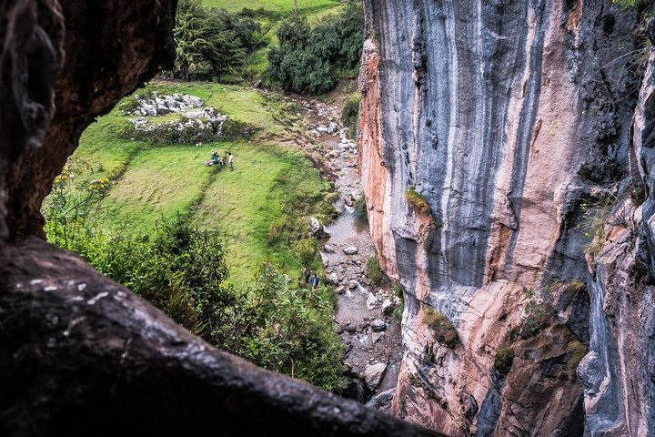 Our horseback ride takes us to visit archaeological sites, starting with the Temple of the Moon (15 minutes). We then head to the Chuspillo area (15 minutes), traversing a 50-minute segment of the Inca Trail through Antisuyu and the “X” Zone, until we reach the Devil’s Balcony. This site features enormous natural limestone formations and a cavern crossed by a river. Above the road and structures, a small cave resembling a window forms a balcony, historically used for rituals related to water and the earth. We’ll spend 20 to 30 minutes exploring the Devil’s Balcony.